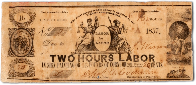 Billet d'une banque de temps créée par Josiah Warren (1857, Source complète dans l'article Josiah Warren's labor notes)